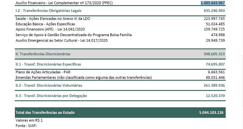 Conforme documentação disponibilizada pelo Ministério, a título de Auxílio Financeiro para Fomento às Exportações (FEX) foram recebidos R$ 420,2 milhões. Relativo a lei Aldir Blanc, foram R$ 29,9 milhões. Recursos específicos para combate à pandemia do coronavírus foram R$ 261,3 milhões (Transferências Discricionárias Voluntárias). Já recursos para socorro dos Estados, previstos na Lei Complementar 173/2020 foram R$ 1.485.643.967. Considerando os demais repasses como o Fundeb e FPE (veja a tabela do Ministério da Economia), o total de recursos recebidos totaliza R$ 5.044.103.126,00.